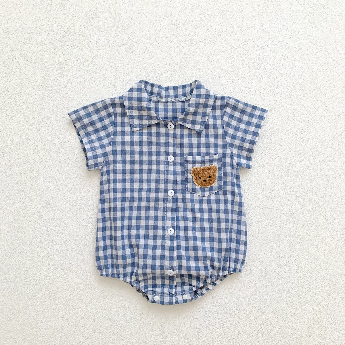 Baby Boy Plaid Onesie – Teddy Bear Short Sleeve Collar Onesie